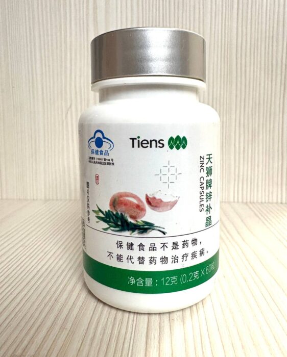 TIENS Zinc – an essential trace element for healthy skin, hair, nails, the nervous system, and immunity. Supports blood clotting, mental health, and combats anemia. Contains zinc lactate, glucose, egg protein, and micronutrients.